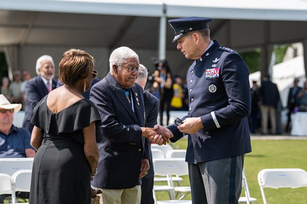 Medal of Honor recipient Melvin Morris alongside his wife talks with Vice Chief of Space Operations U.S. Space Force Gen. David D. Thompson.