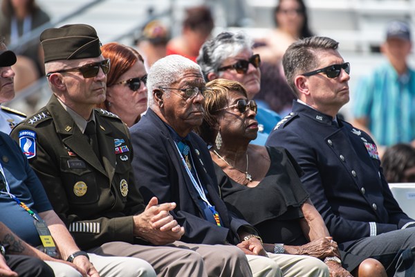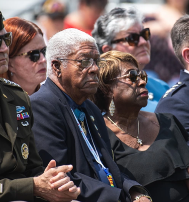Medal of Honor recipient Melvin Morris and his wife sit with other distinguished guests during the Welcome Home Opening Ceremony..
