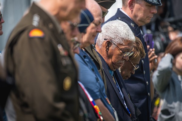 Medal of Honor recipient Melvin Morris bows his head during the invocation for the Opening Ceremony.