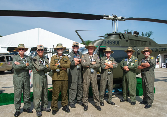 North Carolina Helicopter Pilots Association members stand in front of one of the four static Hueys at Camp Legacy.