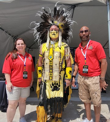 Participating exhibitors, Native American Percy Warcloud Edwards stands between members of the Defense Commissary Agency.