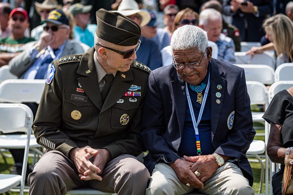 Vice Chief of Staff of the U.S. Army Gen. Randy A. George sits with Vietnam War Medal of Honor recipient Melvin Morris.