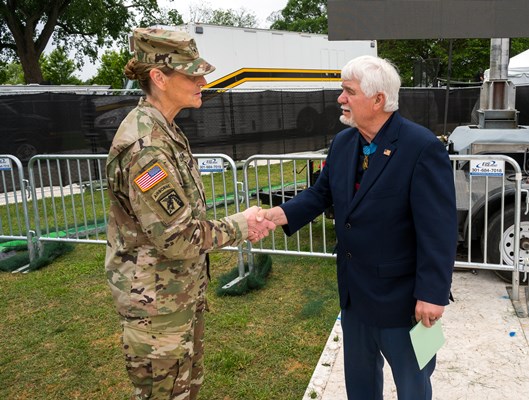 Vietnam War Medal of Honor recipient James C. McCloughan is greeted by U.S. Army Brig. Gen. Joy L. Curriera