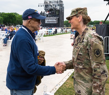 Vietnam War Medal of Honor recipient Paris D. Davis is greeted by U.S. Army Brig. Gen. Joy L. Curriera.