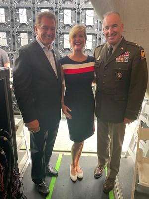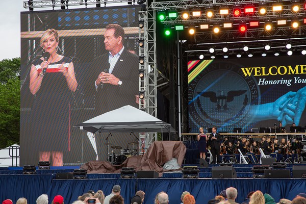 Welcome Home Ceremony Co-Hosts Joe Theismann and Sharlene Wells Hawkes stand next to VWC Director U.S. Army Maj. Gen. Edward J.Chrystal, Jr.